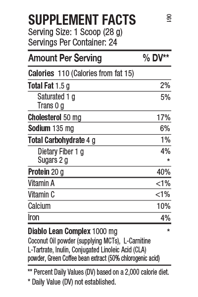 Diablo Protein Complex (Whey Protein Concentrate 80%, Milk Protein Isolate, Whey Protein Isolate, Hydrolyzed Whey Protein, Micellar Casein), Diablo Lean Complex (Coconut Oil powder (Coconut oil, corn syrup solids, sodium caseinate, mono and diglycerides, sodium silico-aluminate), L-Carnitine L-Tartrate, Inulin, Conjugated Linoleic Acid, Green Coffee bean extract), Natural and Artificial Flavors, Gum Blend (Cellulose, Xanthan, Carrageenan), Salt, Enzyme Blend (Bromelain, Lactase), Sucralose, Acesulfame Potassium.