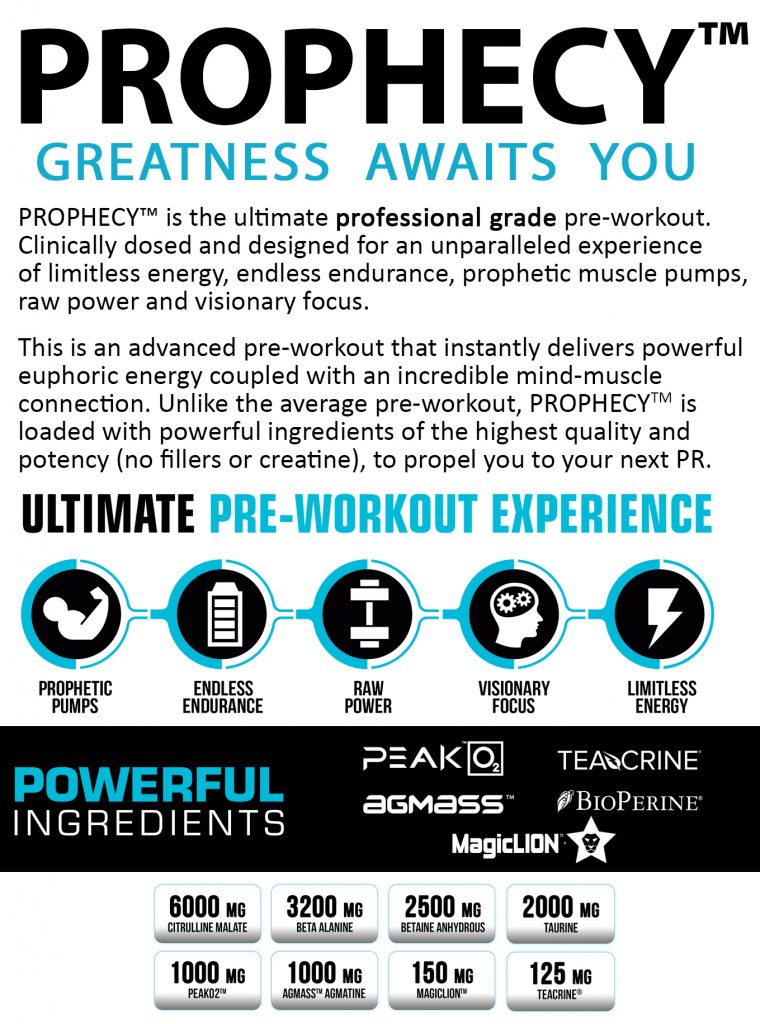 PROPHECY™ is the ultimate professional grade pre-workout. Clinically dosed and designed for an unparalleled experience of limitless energy, endless endurance, prophetic muscle pumps, raw power and visionary focus.