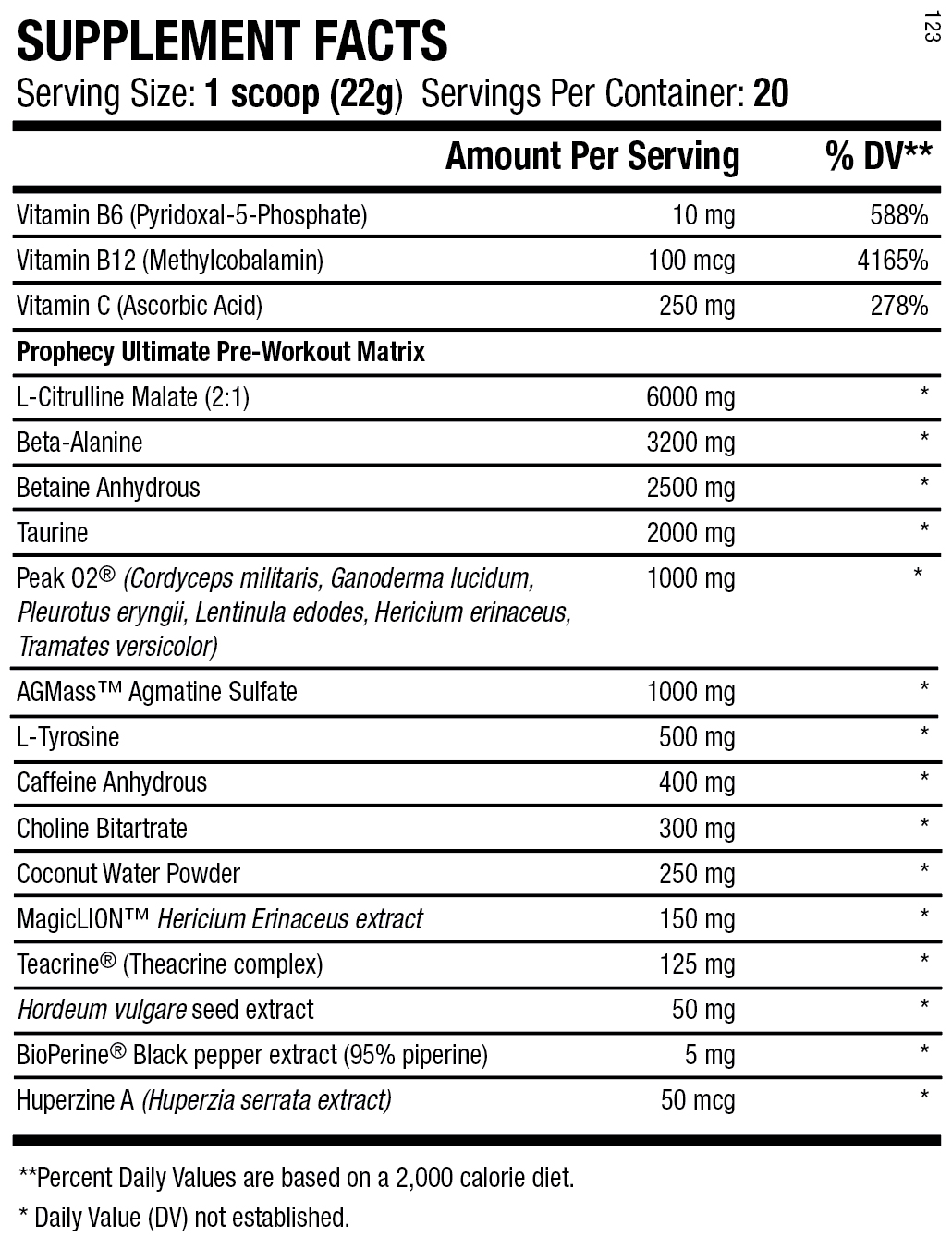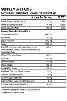 DIRECTIONS: Mix 1 scoop (22g) of PROPHECY™ with 8 to 16 oz of cold water and consume 15-30 minutes before training. To assess tolerance, begin with 1/2 scoop (11 g) mixed in 4 to 8 oz. of water. Read entire product label and warnings prior to using.