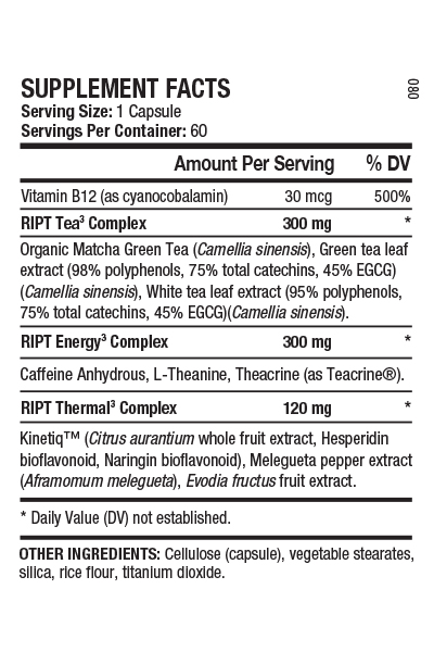 Bringing together several powerful ingredients found in nature, RIPT can help sculpt your physique: Organic Matcha Green Tea, a potent source of natural antioxidants, Theanine and Teacrine® for sustained no-crash energy, and the next-generation thermogenic patented ingredient combination KINETIQ™, which promotes increased metabolism and exercise performance. All of this is wrapped in 1 convenient and concentrated veggie capsule, making it easy to use and take with you on the go.